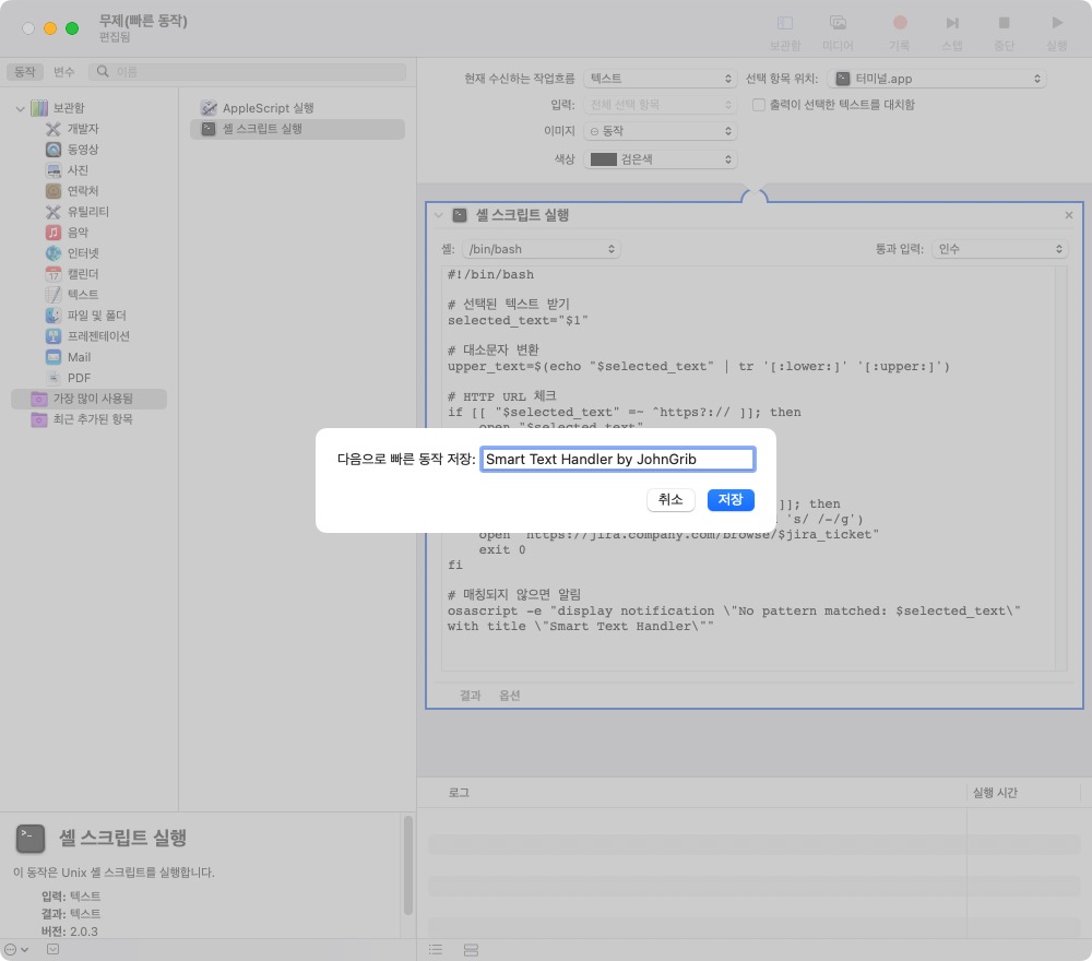 또는 위의 내용을 셸 스크립트 파일로 저장하고, Automator에서 다음과 같이 스크립트를 지정해줘도 된다.