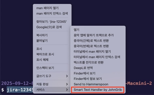 터미널에서 관련된 문자열이 출력되었을 때, 마우스로 드래그하고 우클릭하면 서비스에서 내가 만든 기능을 찾을 수 있다.