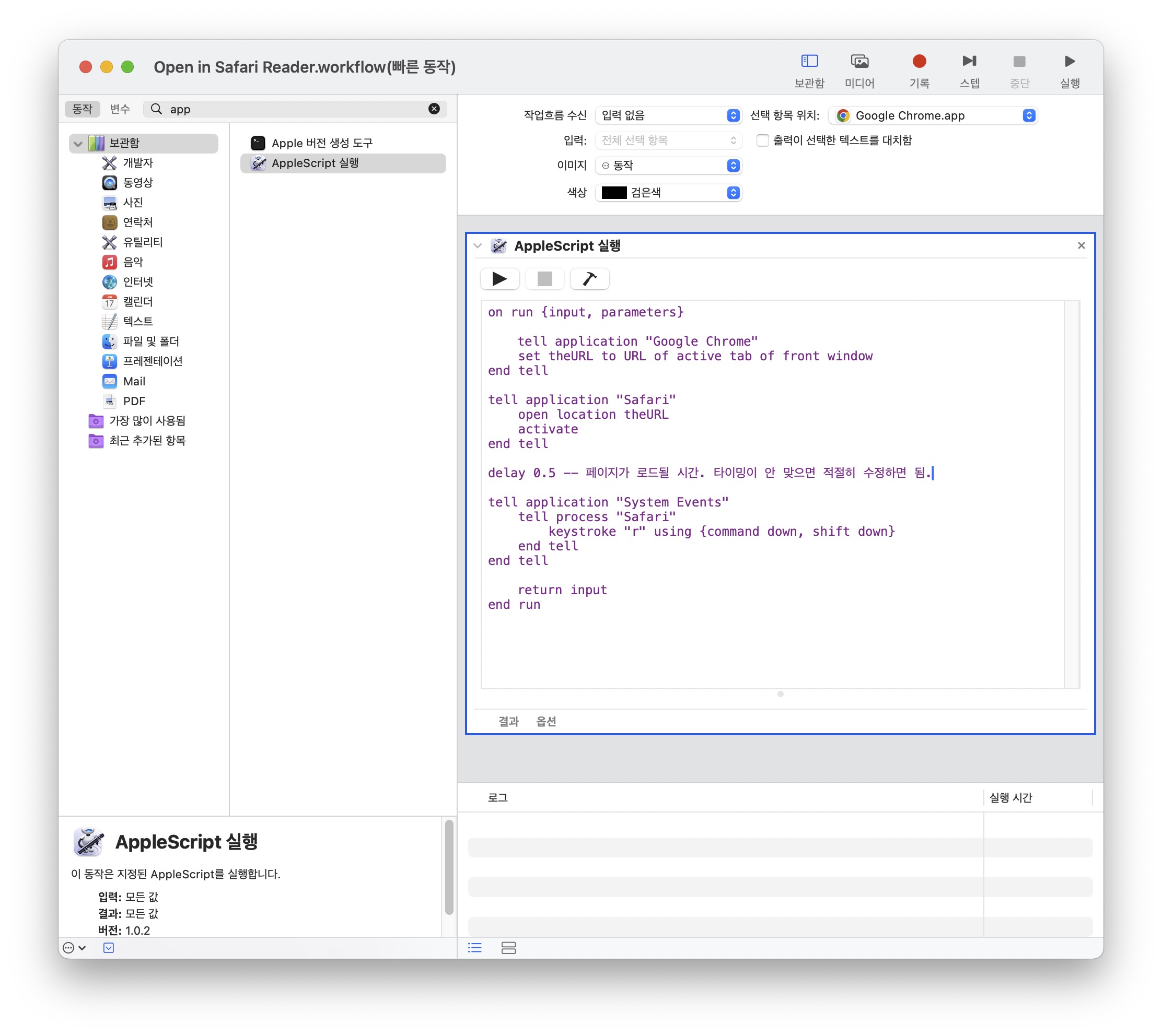 그래서 Chrome 에서 특정한 단축키를 누르면 Safari에서 해당 페이지를 열고 Safari의 읽기 도구를 실행해주는 도구를 만들어 보았다.